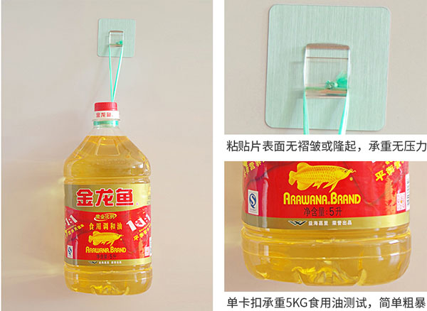 在原材料上,無痕卡扣采用的是優(yōu)質(zhì)的可移無痕膠,以及優(yōu)質(zhì)PC片材。優(yōu)質(zhì)的原材料保證了無痕卡扣具備強勁的承載力。即使是在懸掛5KG食用油后,粘貼片表面也無褶皺或隆起,承重力具有保障。