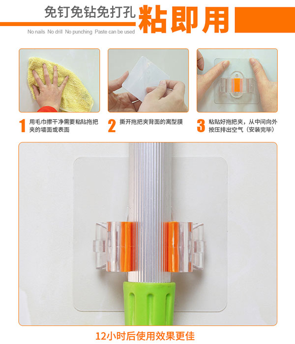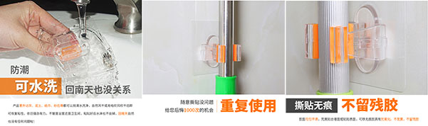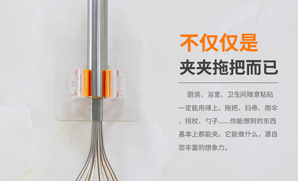 可是,如果粘錯位置了怎么辦呢?當然是直接撕下來,調整好位置再次粘貼上就行了。這個也正是可移拖把夾最顯著的特點之一,即可重復使用。此外,在整個撕貼過程中,也可以保證墻面干凈整潔,不留殘膠,既經濟又環保。而它的使用范圍也比較廣泛,無論是廚房、浴室、衛生間、還是其它場所,只要表面平整無油無粉末即可粘貼。