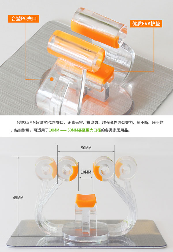 除了安裝簡便外,它的質量也是經過專業檢測的。設計師在產品設計之初,就考慮到了普通塑料夾因為缺少彈性,在頻繁的使用中容易斷裂,從而采用了高彈性優質PC夾扣,它適用于絕大部分口徑的家居用品,能夠接受直徑為8-40mm的棍狀物件。設計師為加強它的穩固性,還給它加上了防滑墊,相當于上了雙重保險,能夠保證拖把一旦夾好就絕不會滑動。